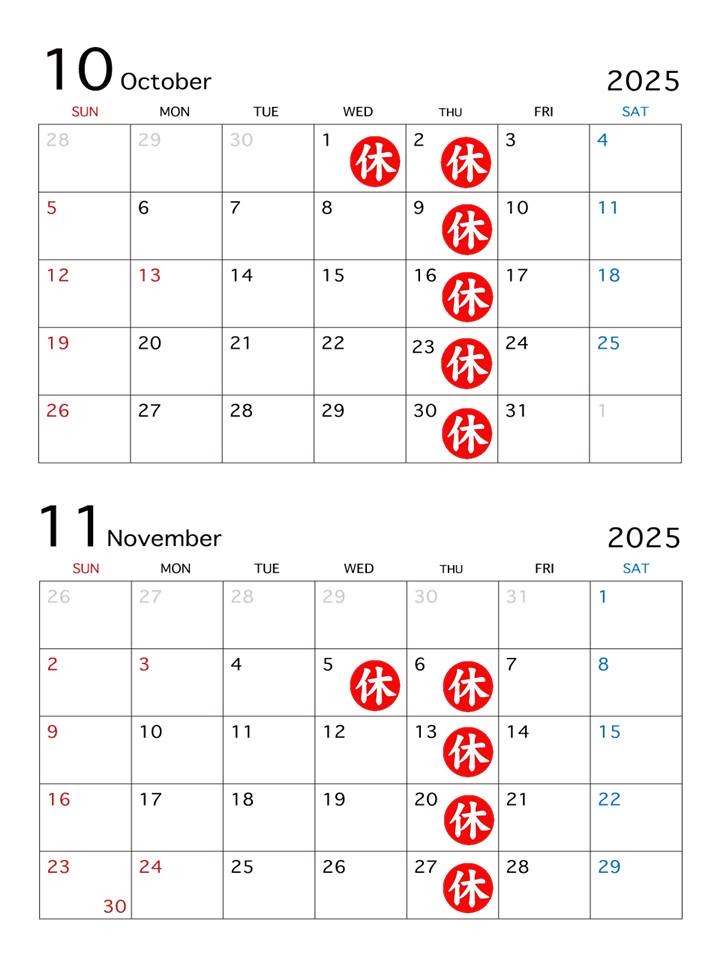 10月11月の営業カレンダー